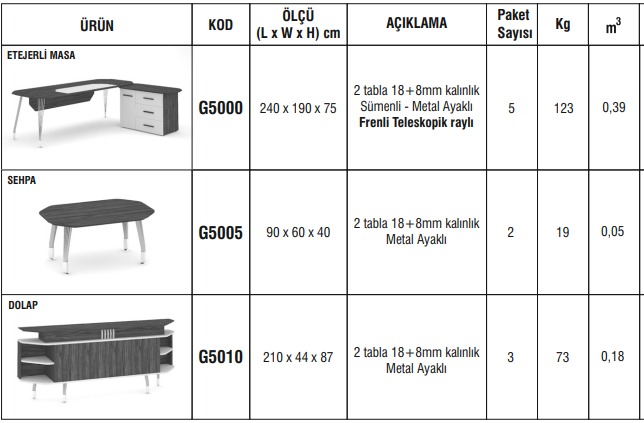 - L Masa (Etejerli): 240 x 190 x 75 cm, 18+8 mm tabla, sümenli, metal ayaklı, frenli teleskopik ray sistemi