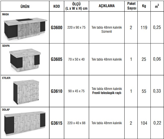 Bu masa takımı, iş hayatınızda konforu ve verimliliği artırırken ofis ortamınıza modern bir hava katar. Hem küçük hem de büyük çalışma alanlarına uygun seçenekleriyle ideal bir çözüm sunar.