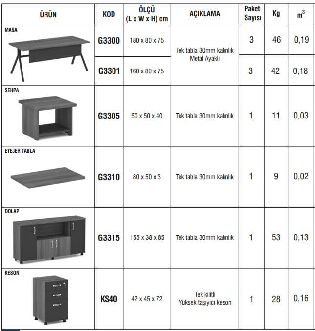 - Malzeme: 30 mm kalınlıkta tek tabla yüzey.
