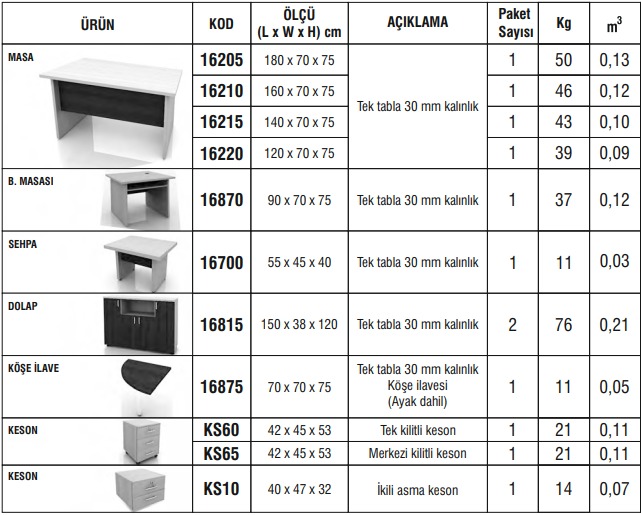 Ofislerinize modern bir görünüm ve üstün işlevsellik kazandırmak için tasarlanan bu masa takımı, farklı boyut seçenekleri ve kaliteli malzemesiyle çalışma alanlarınızı dönüştürür. Zarif tasarımıyla ofisinize profesyonel bir hava katan ürün, estetik ve pratik detaylarla donatılmıştır.